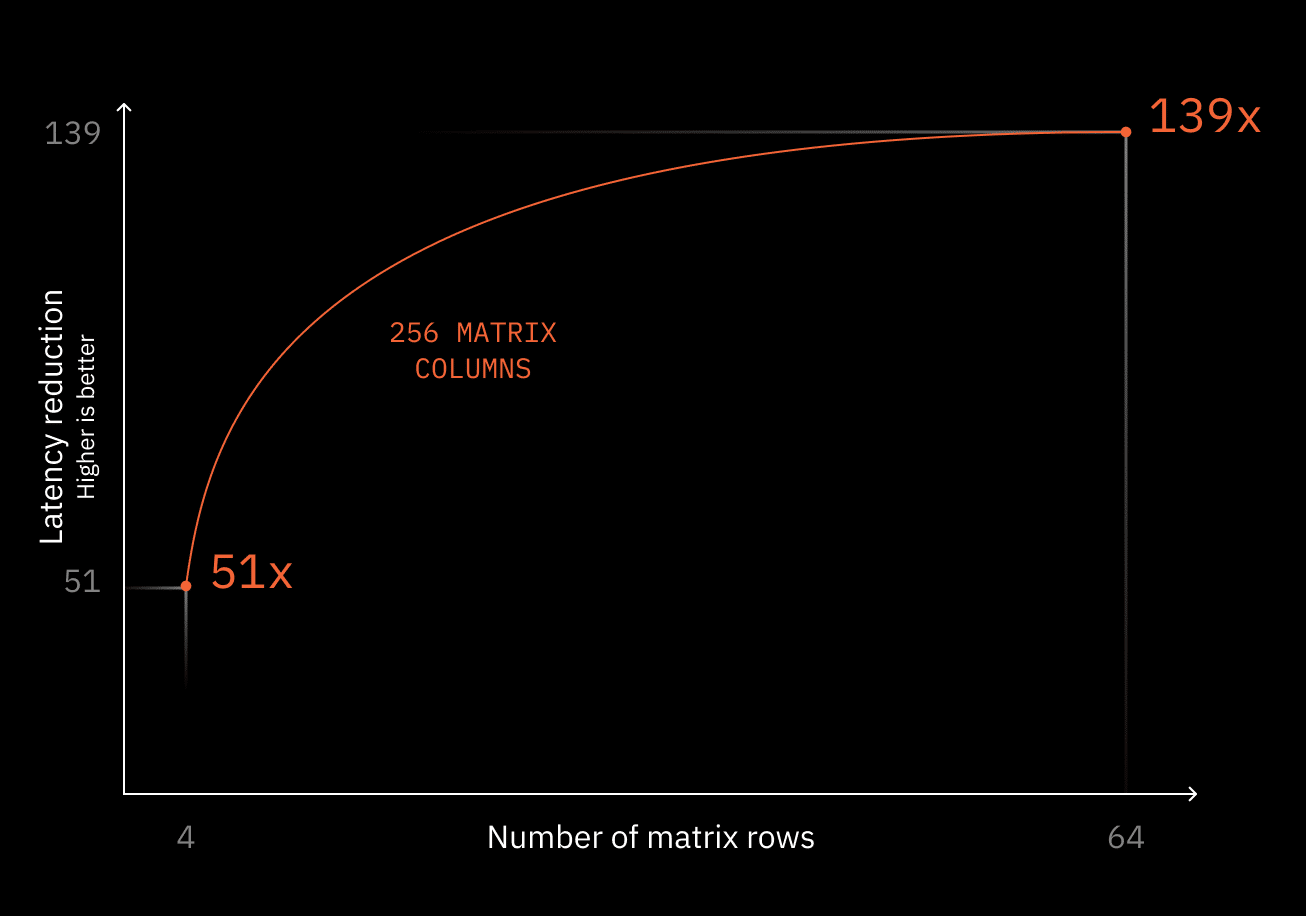 At the most basic level, ComputeRAM™ enables embedded microcontrollers to perform fast and efficient matrix-vector products. By offloading up to 99% of model operations to memory, reducing bus activity, and leveraging an advanced in-memory computing engine, an Arm Cortex-M0 enhanced with ComputeRAM™ delivers up to 139x faster processing and 158x better energy efficiency than an Arm Cortex-M0 with conventional SRAM memory under typical operational conditions.